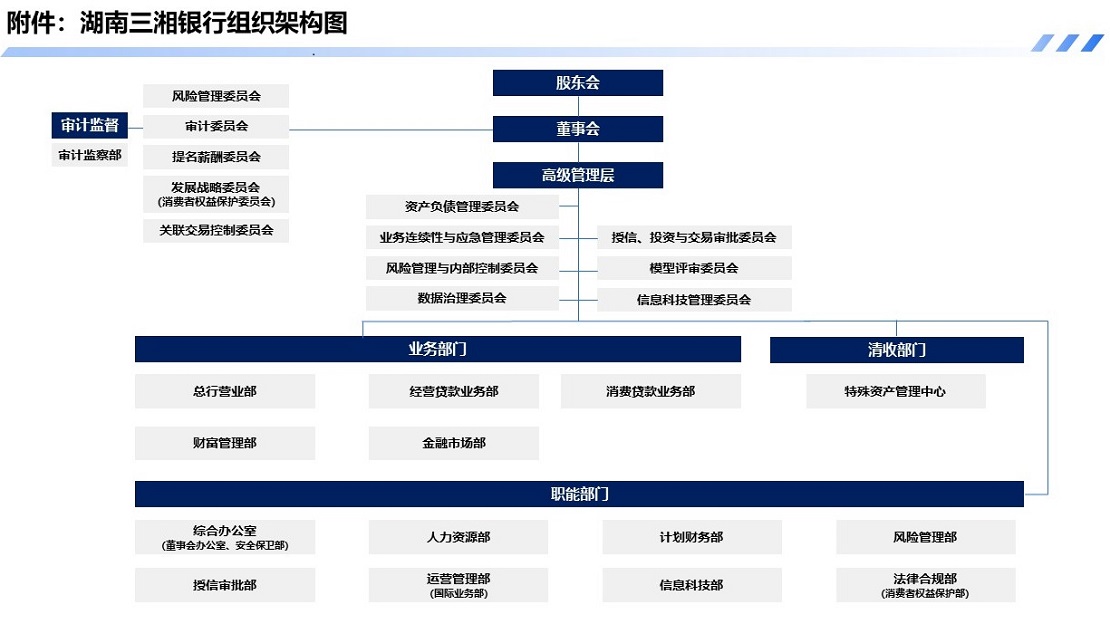三湘银行根据《公司法》《商业银行法》《银行保险机构公司治理准则》等相关法律法规与监管要求,按照上市银行规范,初步构建了“决策科学、执行有力、监督有效、运转规范”的法人治理结构,充分发挥董事会在公司治理体系中的核心作用,股东会、董事会、高级管理层职责清晰、协同运作、相互制衡。